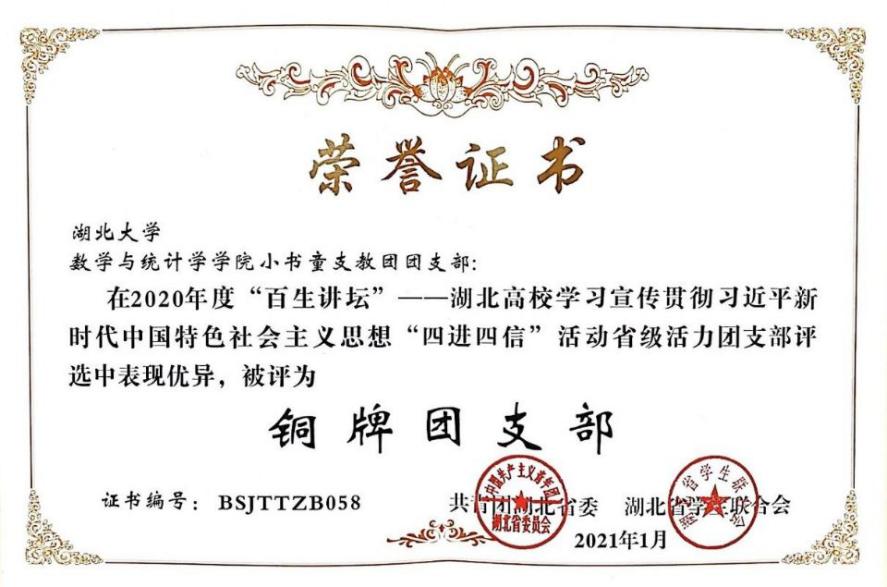 为持续推进学习宣传贯彻习近平新时代中国特色社会主义思想“进支部、进社团、进网络、进团课”,2020年3月,团湖北省委、湖北省学联继续在全省高校团学组织中部署开展2020年度“百生讲坛”系列活动。历经校院班层层选拔推广,2020年10月,历经材料审核、五大赛区省级预赛、省级复赛暨示范巡讲活动同步推动,公司“小书童”支教团团支部荣获2020年百生讲坛“铜牌团支部”。