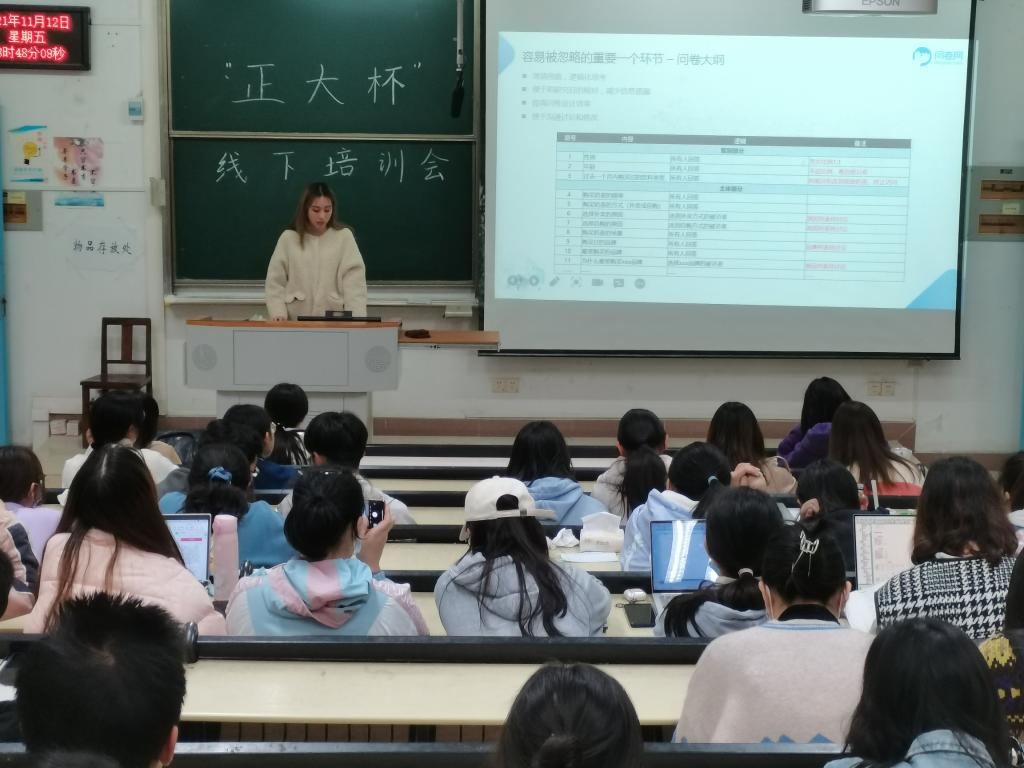 2021年11月12日晚18:30,公司组织开展了“正大杯”第十二届全国市场调查与分析大赛赛前指导工作,上海众言网络科技有限公司的拓丽霞、王童文指导专家团队在williamhill中文官网四号教学楼309对参加本次正大杯比赛的同学进行了以“调研与分析那些事儿”为主题的赛前培训。