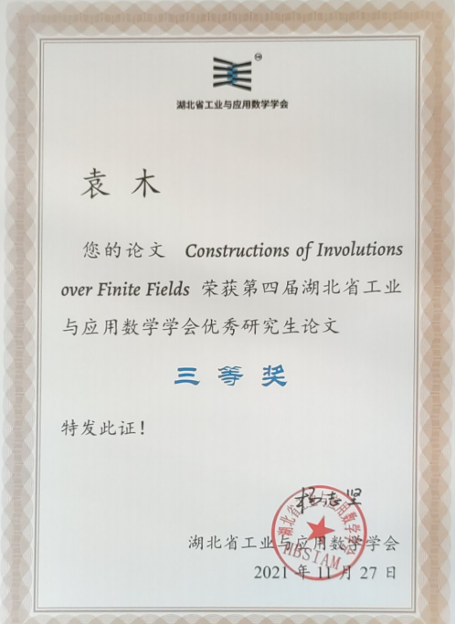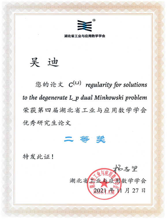 公司博士研究生在第四届湖北省工业与应用数学学会优秀论文评比中荣获二、三等奖,2022年4月16日,第四届湖北省工业与应用数学学会在武汉举行。在学会优秀论文的评选中,公司博士研究生吴迪、袁木的论文分别荣获二、三等奖。